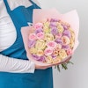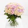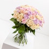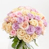 £ 149A beautiful pastel mixed rose hand bouquet, full of lush soft-toned roses in pinks, oranges, purples, and yellows. This bouquet comes wrapped in pink paper to compliment the soft colors and is the perfect choice for any occasion, including, thank you, congratulations, or just because!
