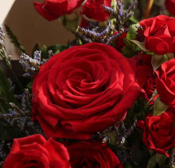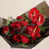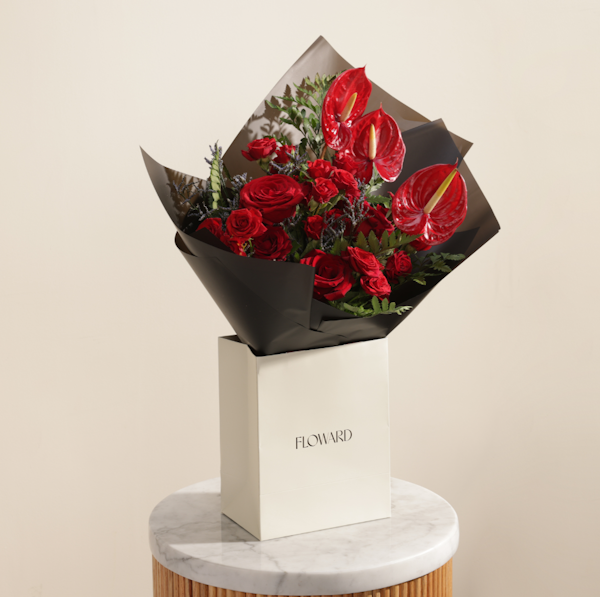 SKU FC01673Express your deepest emotions with this striking arrangement of red roses, red baby roses, and red anthurium, elegantly wrapped in black and presented in a signature Floward box. Perfect for romantic surprises, anniversaries, or special occasions, this bouquet embodies passion and elegance in every bloom. Whether you're celebrating love, appreciation, or a heartfelt moment, this luxurious floral gift speaks louder than words. With same-day delivery and premium quality flowers, making a grand romantic gesture has never been easier. Don’t wait—buy now and make someone's day unforgettable!