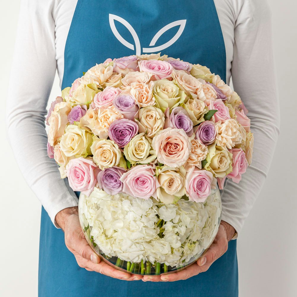 A bouquet of white hydrangeas, peach carnations, and pastel mixed roses arranged in a glass vase would create a charming and romantic flower arrangement. White hydrangeas symbolize emotions and are often used to convey a message of gratitude or peace. The soft peach color of the carnations represents joy and happiness, while the pastel mixed roses symbolize love and appreciation, your perfect special gift to your beloved person!