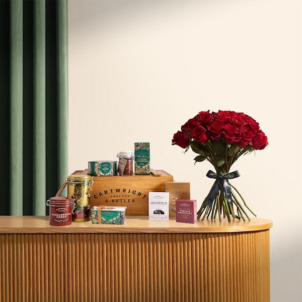 This elegant and unique gift brings a festive touch to every celebration, blending a precious selection of Cartwright & Butler treats with a charming bouquet of red roses. It’s a warm way to show appreciation and care, offering a thoughtful gesture for those who truly matter. The crate’s rich flavors and the roses’ deep color make this a perfect gift that feels personal, joyful, and wonderfully celebratory. Shop today and make someone’s moment even more special—send now and share the delight.