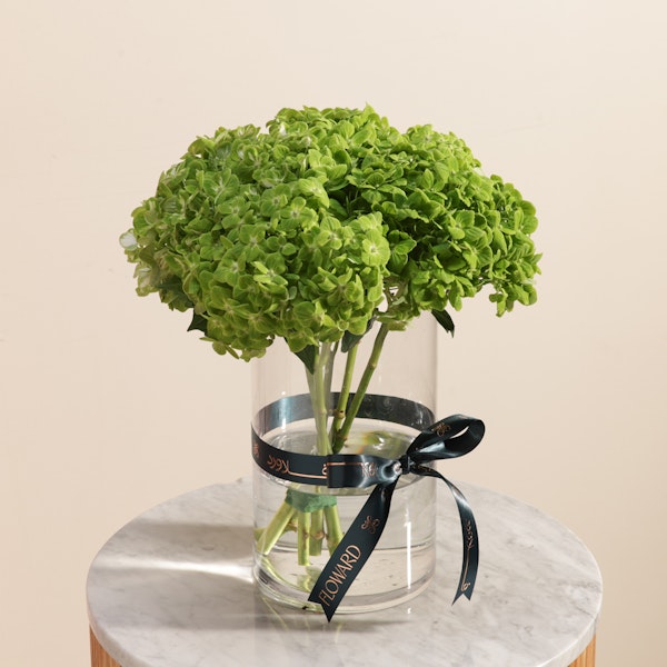 A breath of fresh elegance, this Green Hydrangea in a Cylinder Glass Vase captures nature’s charm in its most refined form. With lush, full blooms and a vibrant green hue, this arrangement radiates tranquility and balance—perfect for brightening up living spaces or adding a sophisticated touch to any setting. Set in a sleek transparent vase and finished with a Floward ribbon, it’s the epitome of modern floral design. Whether as a thoughtful gift or a stylish centerpiece, this piece is designed to leave a lasting impression through its simplicity, freshness, and graceful presentation.
