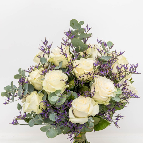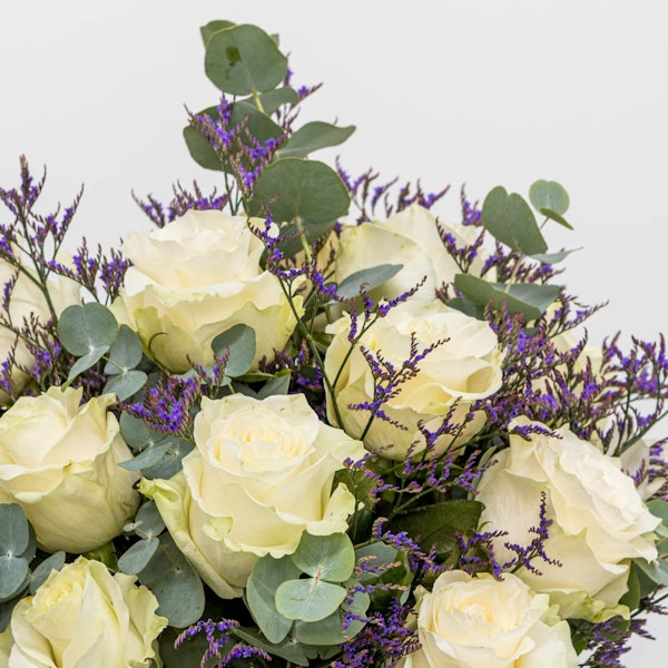 A classic with a twist. This beautiful arrangement features crisp white roses in amongst eucalyptus stems and fragrant limonium. Whether you pop it on your coffee table, or mantelpiece, it will be sure to catch the eyes of your guests when they come around. A great moving-in gift or the perfect way to say thank you.