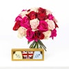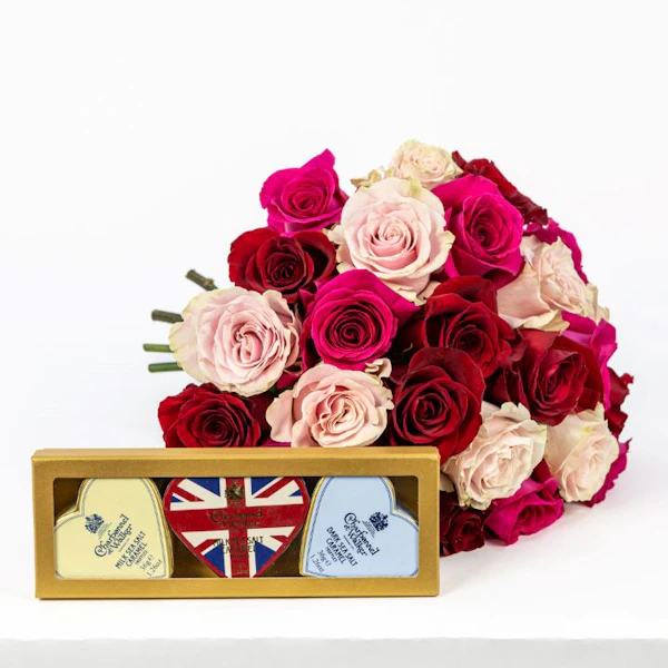 Indulge your loved one with the exquisite Charbonnel et Walker Mini Heart Trio Gift Set. Three charming Mini Hearts filled with our irresistible Sea Salt Caramel Truffles await, featuring Milk Sea Salt Caramel in an elegant cream and navy heart, Dark Sea Salt Caramel in pretty pastel blue, and another Milk Sea Salt Caramel Mini Heart adorned with a striking Union Jack flourish. Presented in an elegant gold gift box, this set is complemented perfectly with a bouquet of 25 Red and Pink Roses. It's the ultimate expression of love and affection.