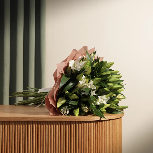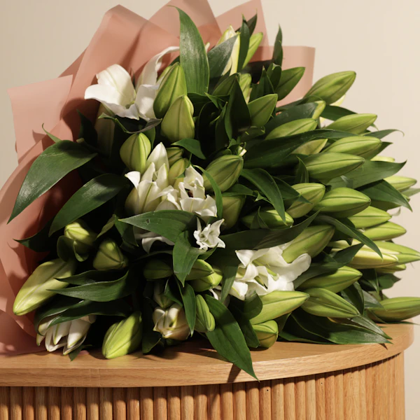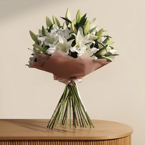 Unveil elegance with our distinctive White Lilium bouquet, nestled in a luxurious Copper Wrap. This one-of-a-kind floral arrangement is more than a gift; it’s a statement of sophistication, perfect for those special occasions that deserve unforgettable memories. With each bloom radiating grace, this bouquet makes an ideal special gift to show just how much you care. Buy now and make someone’s day truly remarkable with a touch of floral artistry.