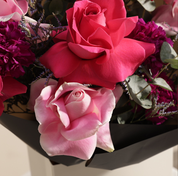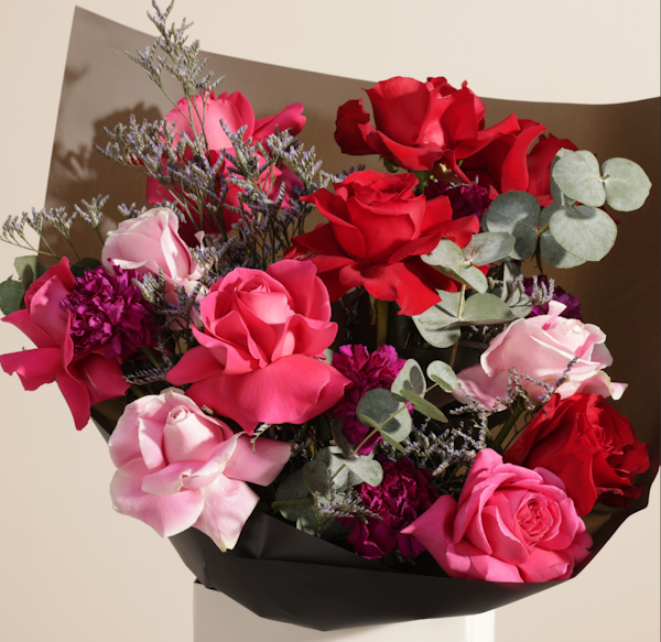 Drape your loved one in timeless elegance with this enchanted romance flowers bouquet, a breathtaking arrangement of lush red, pink, and blush roses, delicately paired with rich purple carnations, soft eucalyptus, and wisps of lavender foliage. This luxurious floral masterpiece is designed to express deep love, admiration, and passion, making it the perfect gift for anniversaries, birthdays, or simply to say “I love you.” Presented in an elegant bag, this bouquet is more than just flowers—it’s a statement of sophistication and heartfelt emotions. Let its captivating beauty speak for you and create an unforgettable moment. Order now and make someone’s day truly special with a gift that whispers love in every petal!