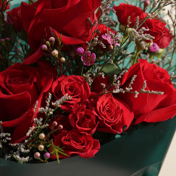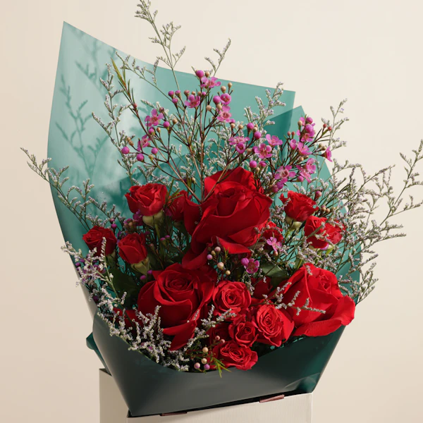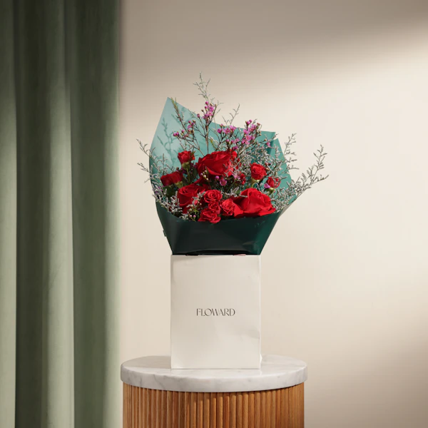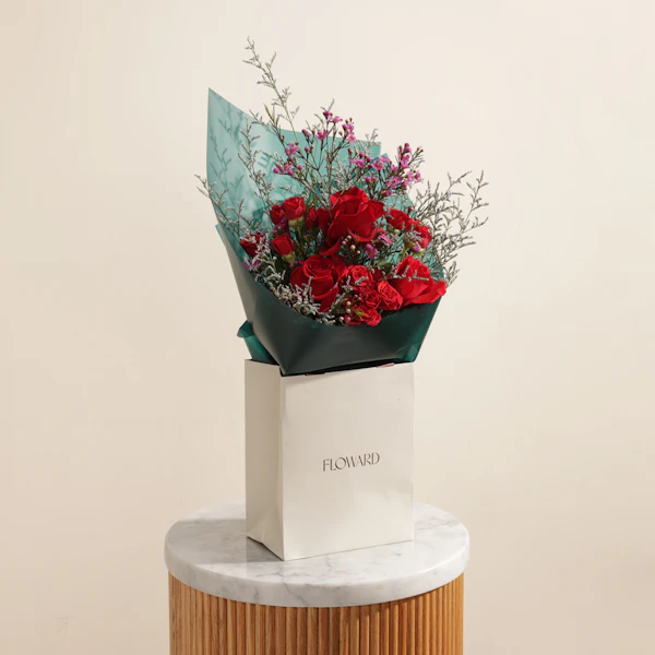 Nothing speaks of passion and admiration more eloquently than the timeless beauty of red roses. This arrangement combines the rich elegance of full red roses with the delicate charm of red baby roses, creating a harmonious display of love, devotion, and romance. Each bloom is carefully selected to symbolize affection and admiration, making this gift more than just flowers—it becomes an unforgettable expression of heartfelt emotions. Wrapped gracefully in a dark teal wrap that contrasts beautifully with the vibrant red, the arrangement is presented with Floward’s signature bag, ensuring a luxurious and thoughtful gifting experience. Perfect for celebrating love, marking milestones, or simply surprising someone special, this bouquet radiates elegance and sincerity in every detail.