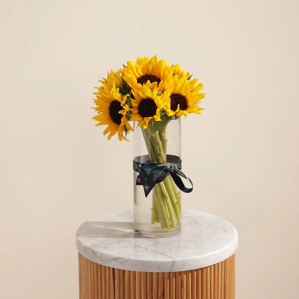Brighten any space with the Stunning Sunflower Vase, a beautiful arrangement of vibrant sunflowers elegantly displayed in a sleek glass vase. These cheerful blooms bring warmth, positivity, and a natural touch to your home or office, making them perfect for any occasion. Whether as a gift or a statement piece, this sunflower vase radiates charm and joy. Its minimalist yet striking design adds sophistication to any décor. Buy today to surprise someone special or enhance your space with this stunning floral arrangement and let the timeless beauty of sunflowers create a delightful ambiance!