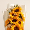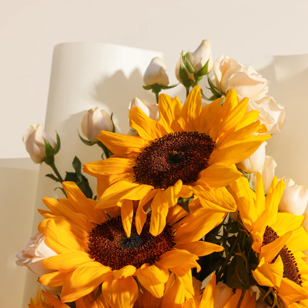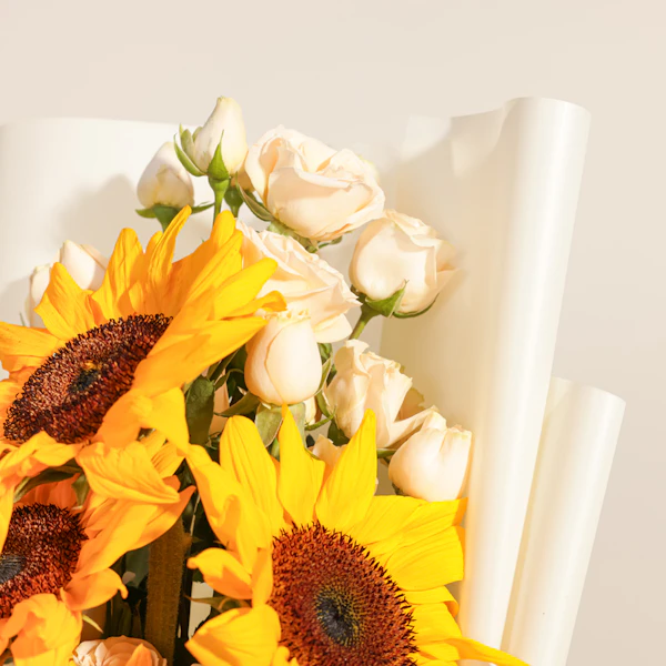 Introducing the Sunflower Symphony Bouquet—a lively hand bouquet that infuses vibrancy and romance into any occasion. This stunning arrangement showcases the golden glow of sunflowers paired with the soft elegance of peach baby roses. Wrapped in a cream wrapping, this bouquet is a visual masterpiece. The harmonious blend of colors and textures makes it an ideal gift to brighten someone's day or to express your heartfelt sentiments with a touch of natural beauty.