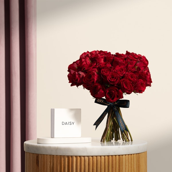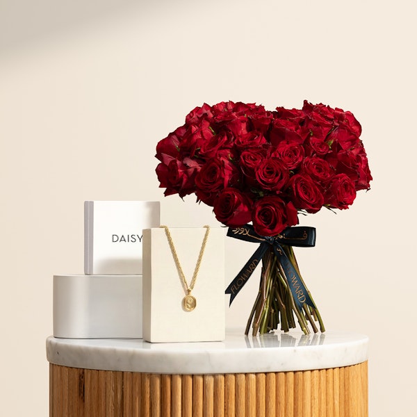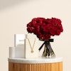 £447A graceful pairing that speaks in soft, meaningful details, the Daisy gold-tone sunflower necklace complements the classic heart bouquet with effortless charm. The warm glow of the necklace adds a refined touch, while the rich red roses create an emotional statement, coming together as a gift filled with elegance, warmth, and heartfelt sentiment.