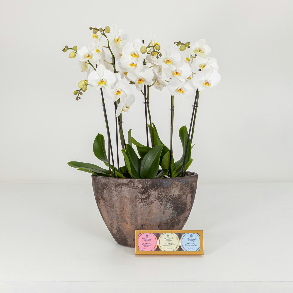 Treat someone special to the luxurious Charbonnel & Walker Trio Truffles Set, featuring the irresistible flavor of Salted Caramel. Paired with a stunning white orchid plant, this gift exudes elegance and sophistication. The decadent truffles offer a delightful taste experience, while the exquisite orchid adds a touch of natural beauty and grace. Perfect for any occasion, this duo symbolizes indulgence and refinement, making it an unforgettable gift that will delight and impress.